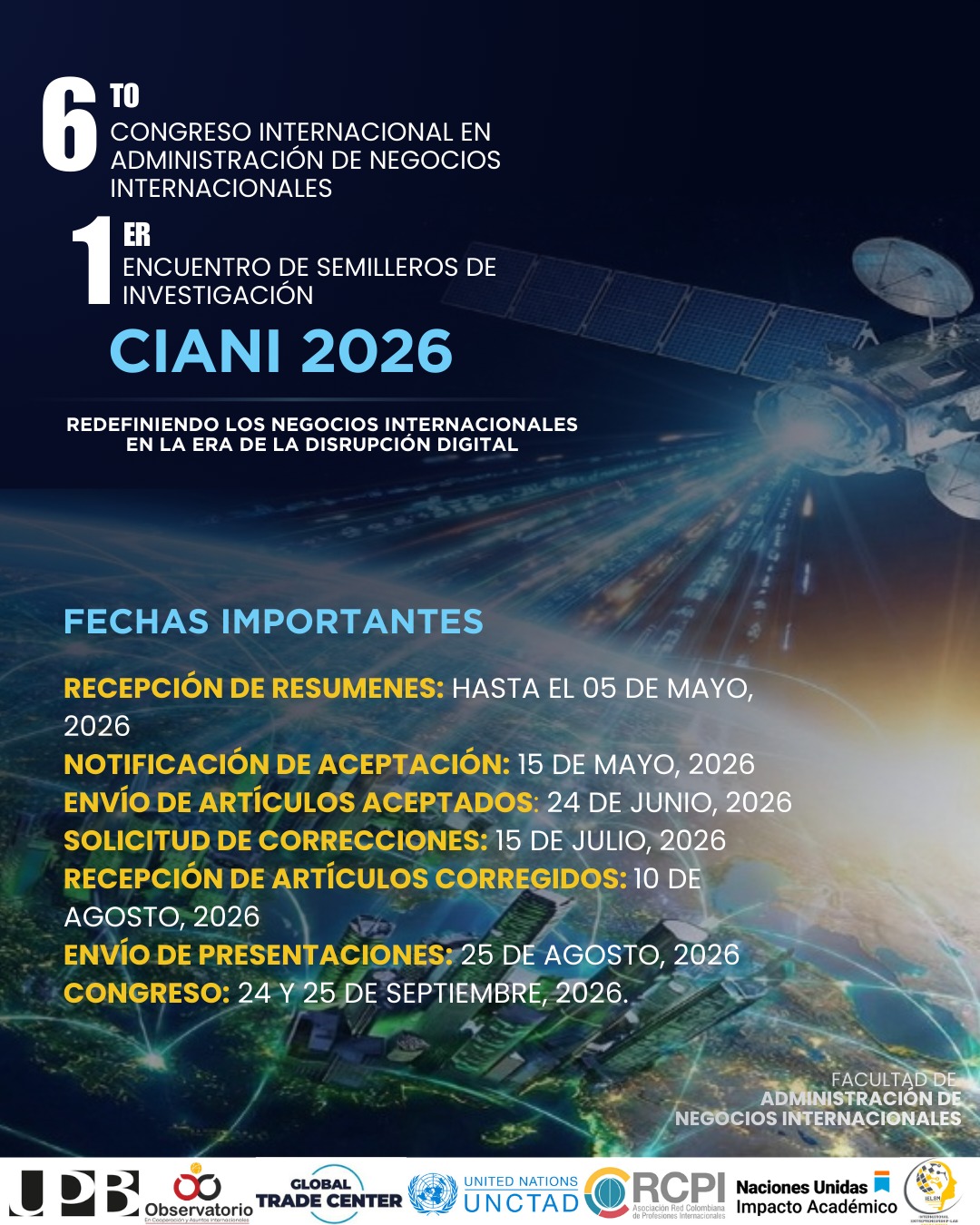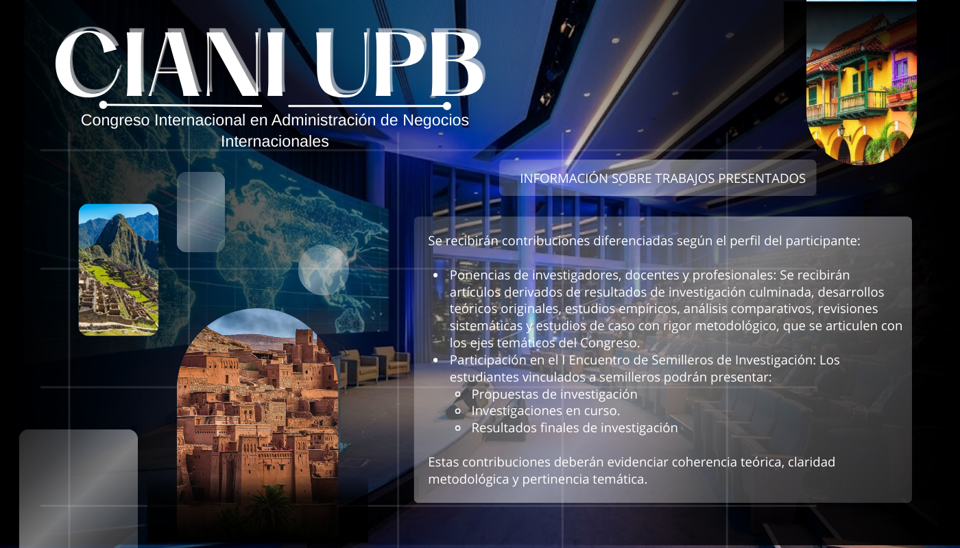 La Facultad de Administración de Negocios Internacionales de la Universidad Pontificia Bolivariana (UPB), seccional Bucaramanga (Colombia), tiene el honor de convocar a la comunidad académica, empresarial y profesional VI Congreso Internacional en Administración de Negocios Internacionales – CIANI 2026 y I Encuentro de Semilleros de Investigación, que se llevará a cabo los días 24 y 25 de septiembre de 2026.